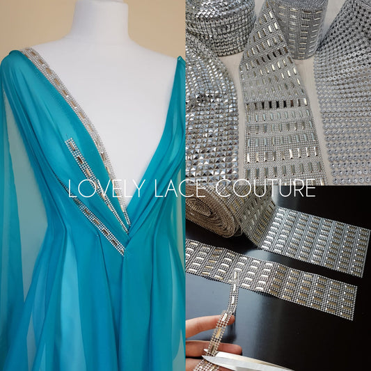 Ribbon Mesh Crystal Silver, Rhinestone appliqués, strap, trim, ribbon for decoration, dresses, evening gowns and accessoires