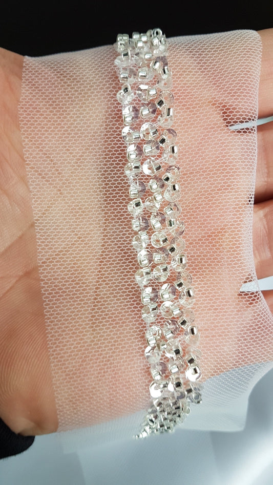 Beaded lace trim in white color, bridal lace trim with beads, Ribbon Lace for bridal or wedding dresses, 140cm length, 1,2cm wide, LL-1480