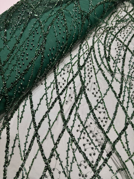 LL-1594, beaded green lace fabric with abstract wave design