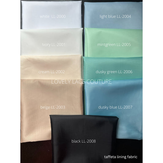 taffeta lining fabric with soft structure and matt sheen in white, ivory, cream, beige, light blue, mint, dusky green, dusky blue and black