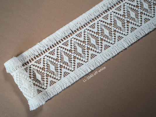 LL-1545, Guipure bridal lace ribbon in off-white with geometrical pattern and fringes, bridal lace trim, boho style, 100cm length, 9cm wide