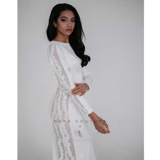 KIARA Dress - Elegant white bridal dress made of satin fabric combined with lace inserts on the side of the dress and on the sleeves.