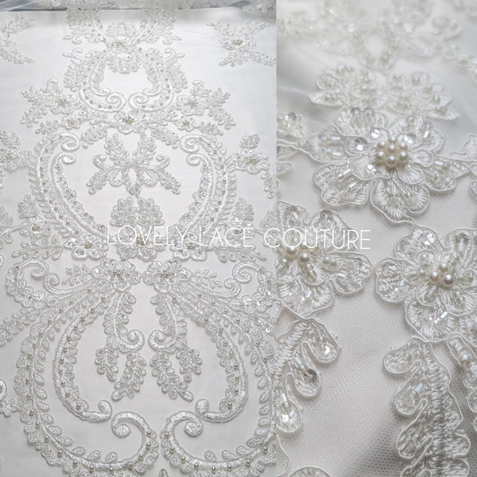 Wunderschöner Braut Spitzenstoff in weißer Farbe, Hochzeitsspitze Stoff mit Blumen und Ornamenten, Stickmuster Spitzenstoff LL-1131