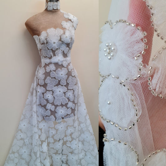 Wunderschöner Brautspitzenstoff mit großen Blumen, 3D-Spitzenstoff in Off-White Farbe LL-1486