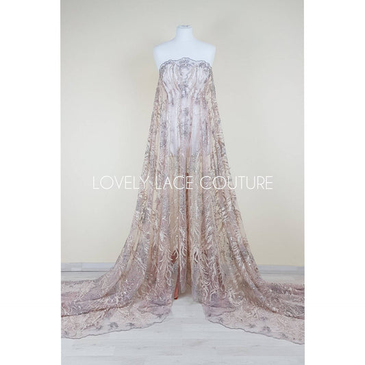 Wunderschöner 3D-Spitzenstoff mit abstraktem Design, Farbige Brautspitze, Hochzeitsspitzenstoff, Bestickte Spitze in Rosé-Beige-Silber LL-1334