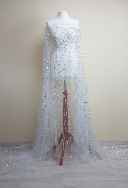 Wunderschöner Stoff in modernem Design, weißer Tüllstoff mit glänzenden Pailletten und Perlen in Silberfarbe LL-1147