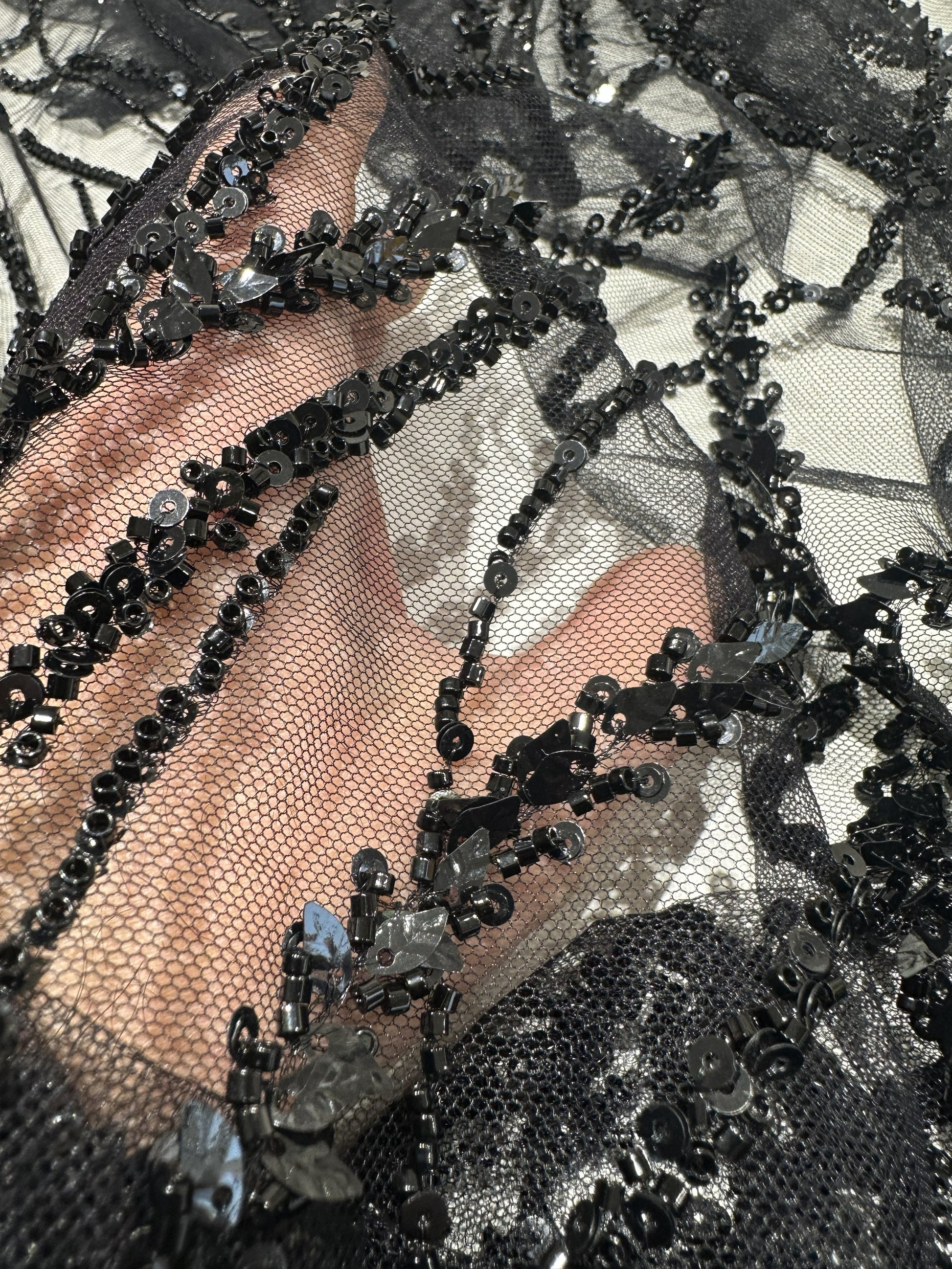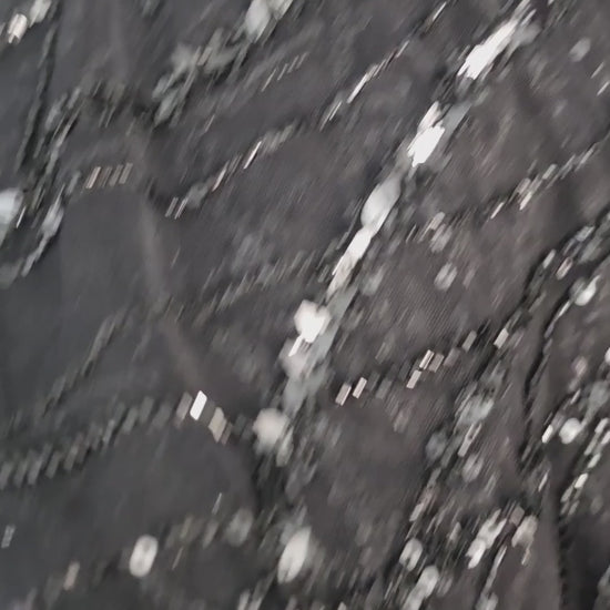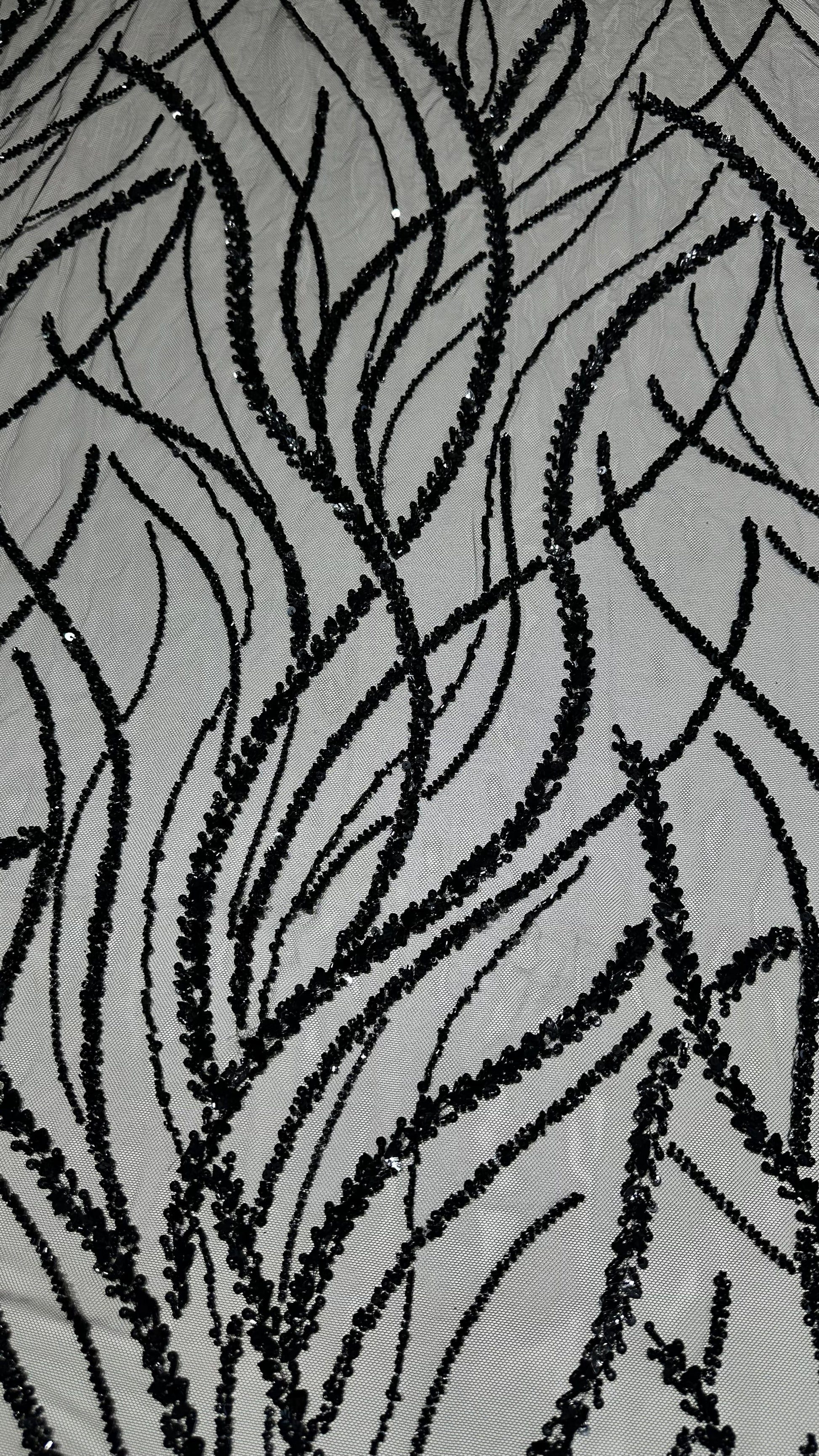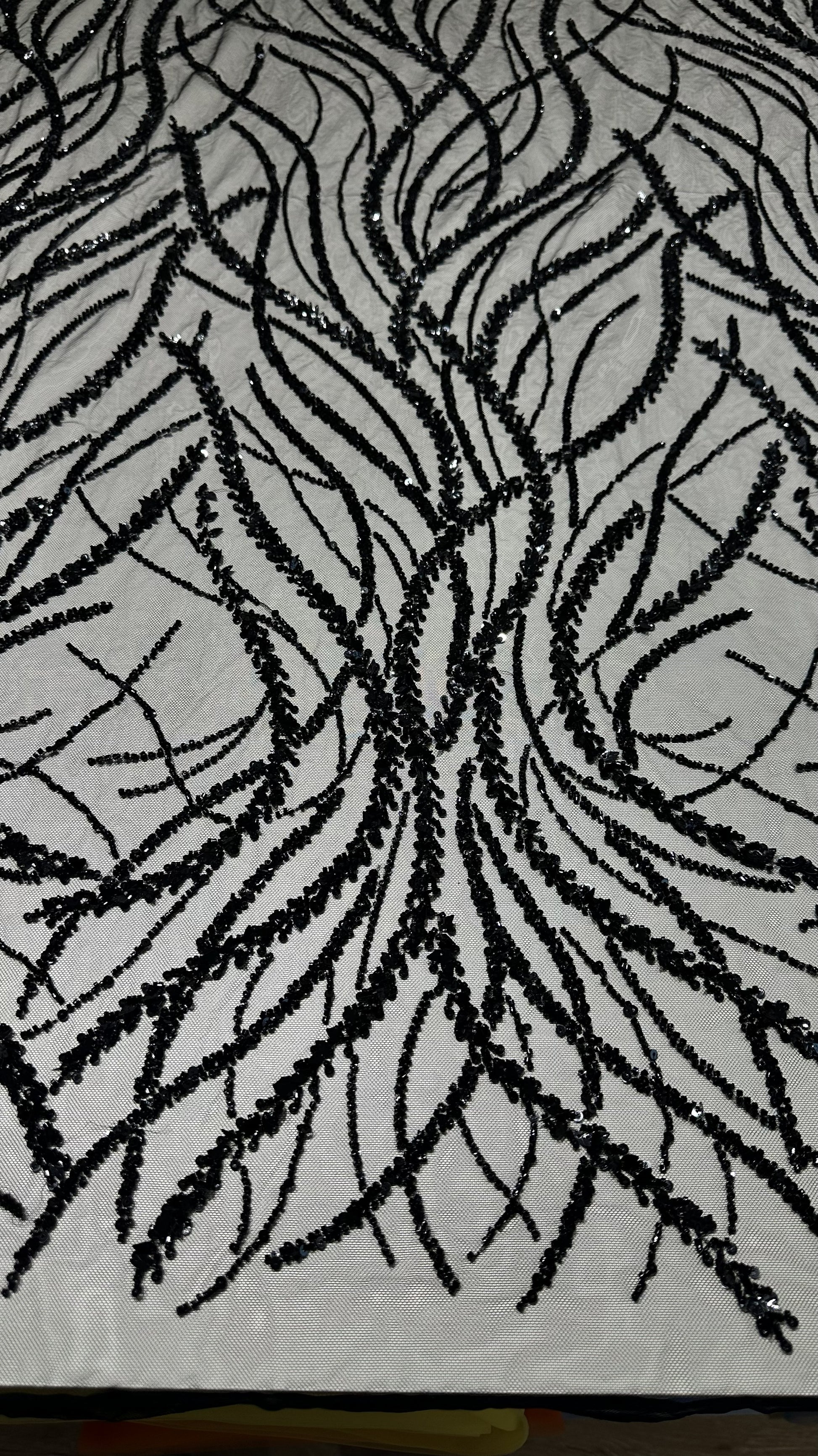 LL-1591, 3d black lace fabric with abstract wave design and big black leaf sequins