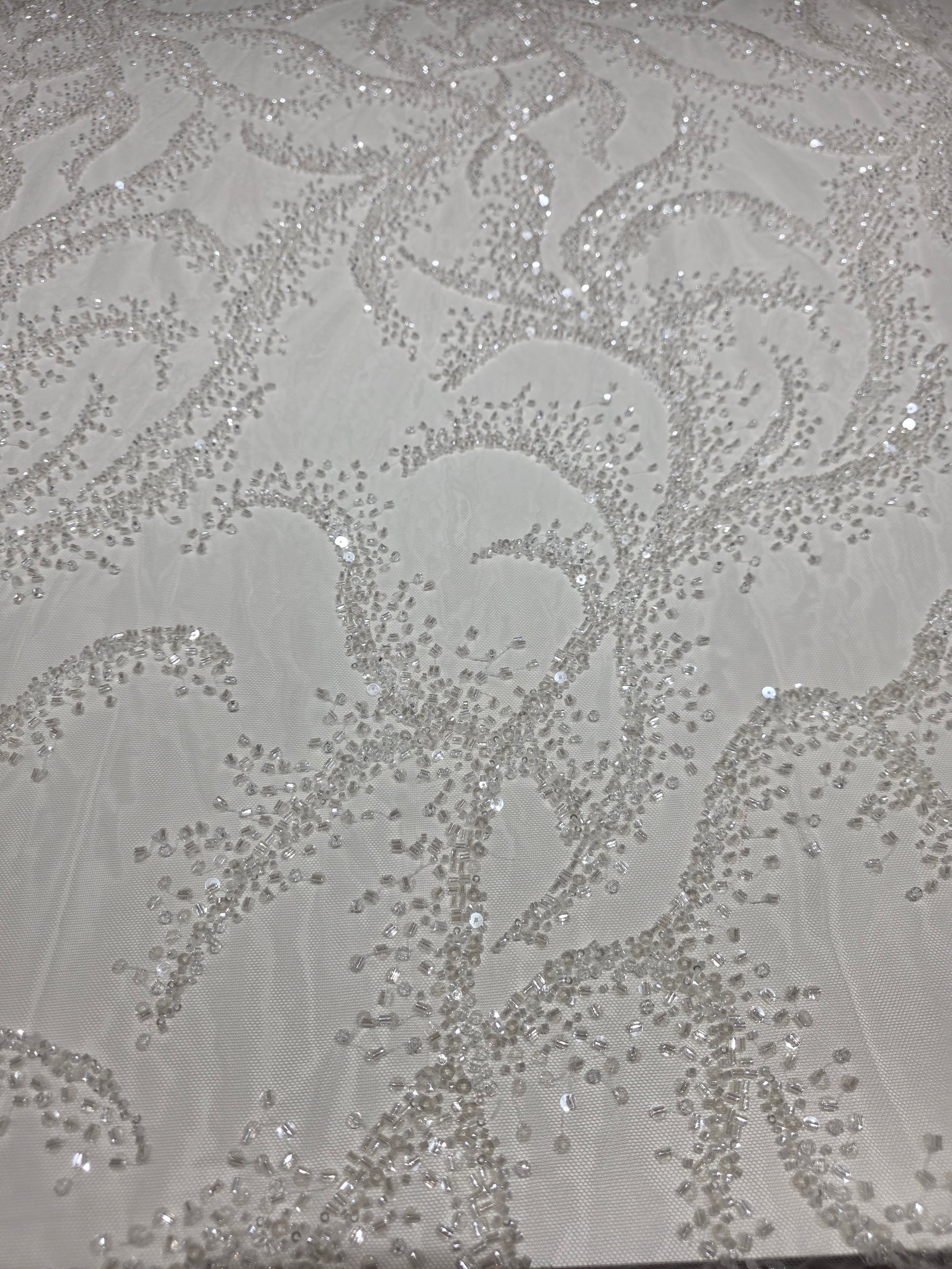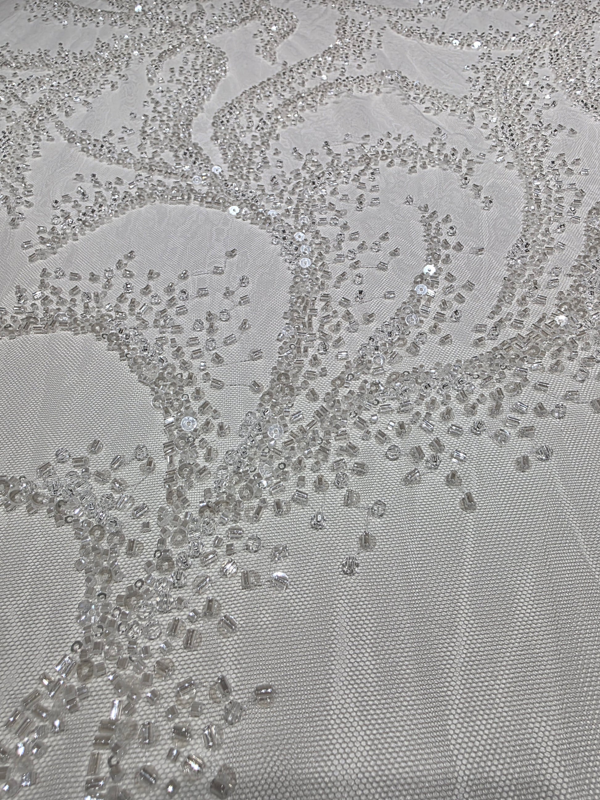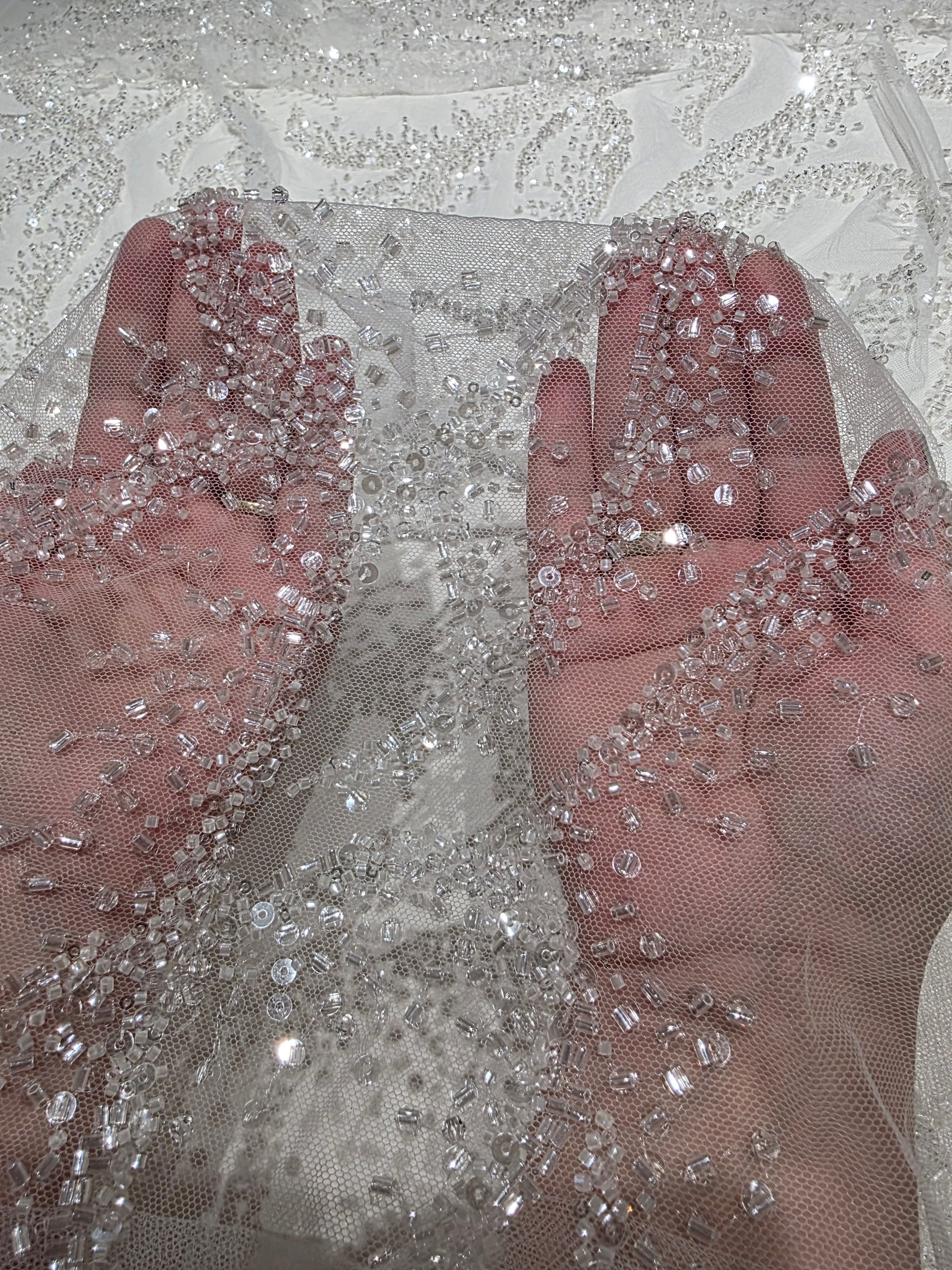 ♛ LL-1587, high quality lace with crystals, beads and transparent sequins in white color. Perfect for wedding dresses, bridal dresses, bridal overalls or figure skating costume, cosplay costumes, ballet dress and much more.