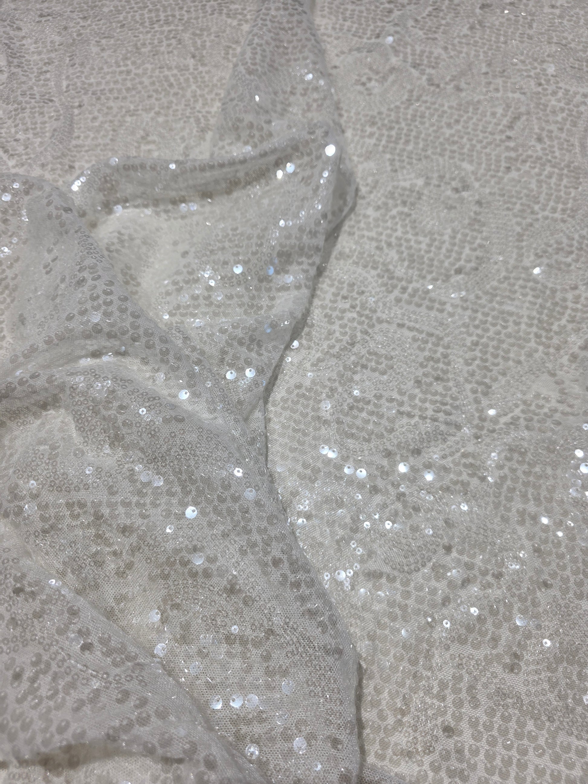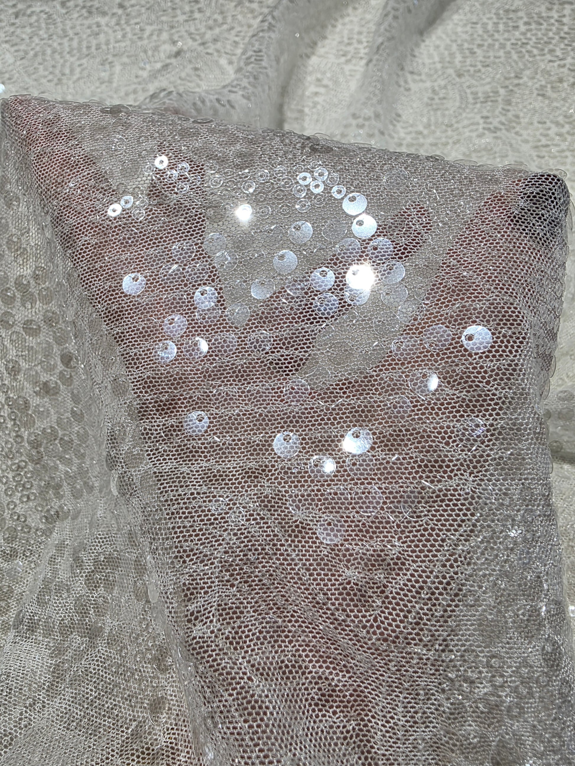 Sparkly transparent mesh fabric with big and small sequins.